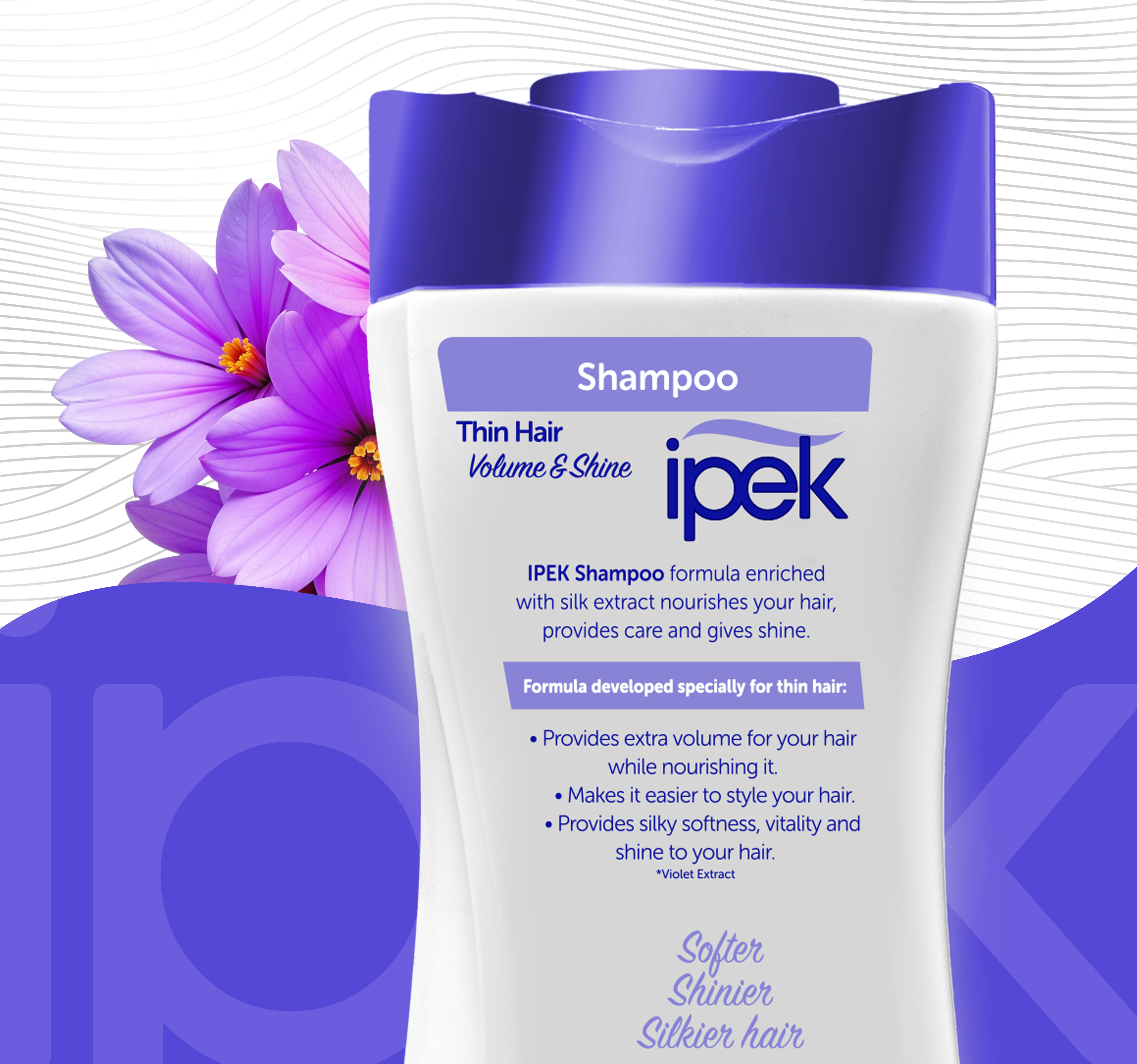 İpek Violet Extract Shampoo, enriched with Pure Silk Extract, nourishes and cares for the hair while giving it natural shine and silky softness. Suitable for daily use.